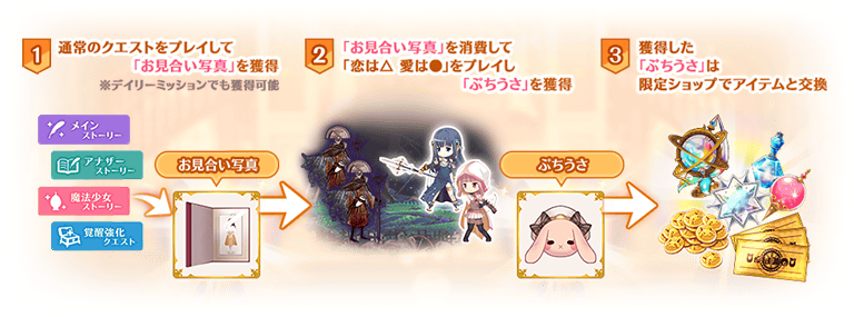 「お見合い写真」を消費すると本イベントのクエストをプレイでき、限定アイテムや覚醒素材と交換できる「ぷちうさ」を獲得できます。