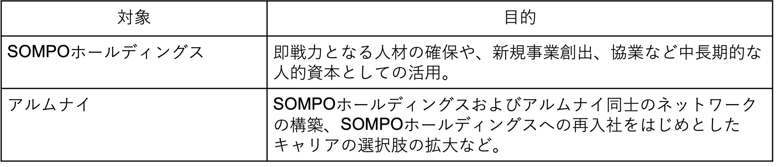 近年、キャリア採用市場の拡大などにより、キャリア形成におけるはたらく人の意識は従来のものから大きく多様化しています。SOMPOホールディングスが取り組んでいる社員一人ひとりのMYパ―パスの追求においても、自己実現に向かって社員が当グループを越えてチャレンジすることもありうる状況に変化してまいりました。MYパーパスに基づくそのようなチャレンジを行った元・社員を貴重な人的資本であると捉え“アルムナイ”としてSOMPOホールディングスとの関係を維持し、互いにコミュニケーション・情報共有し合えるネットワークを構築するため本コミュニティを創設いたしました。