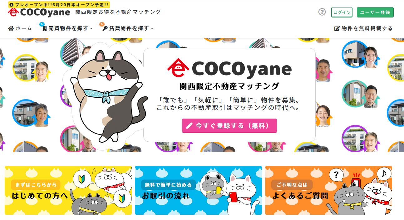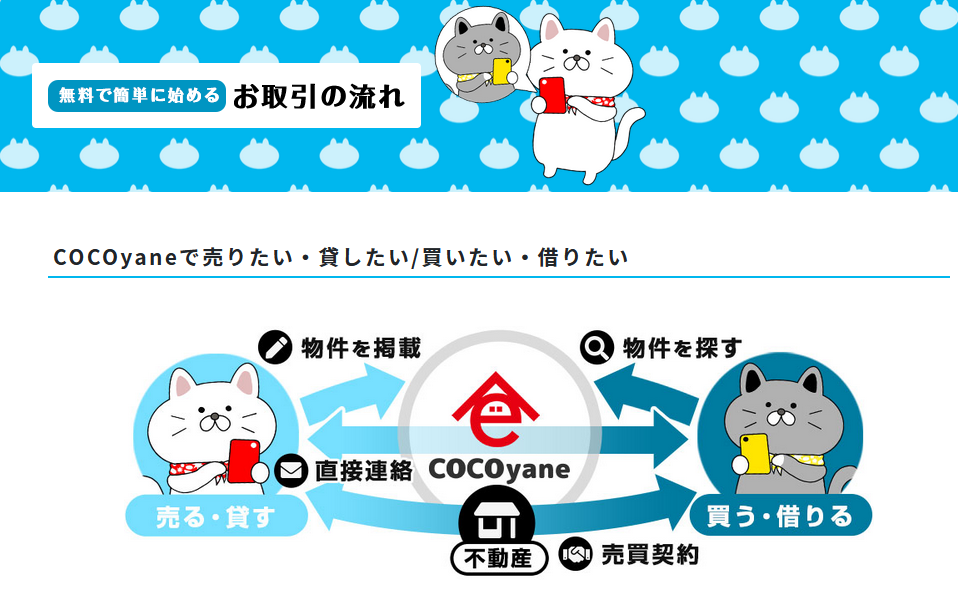 COCOyaneは「誰でも」「気軽に」「簡単に」物件を登録できる不動産マッチングサイトです。