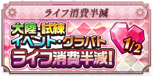 期間中、通常ステージと試練のクエストの消費ライフが半減されます。