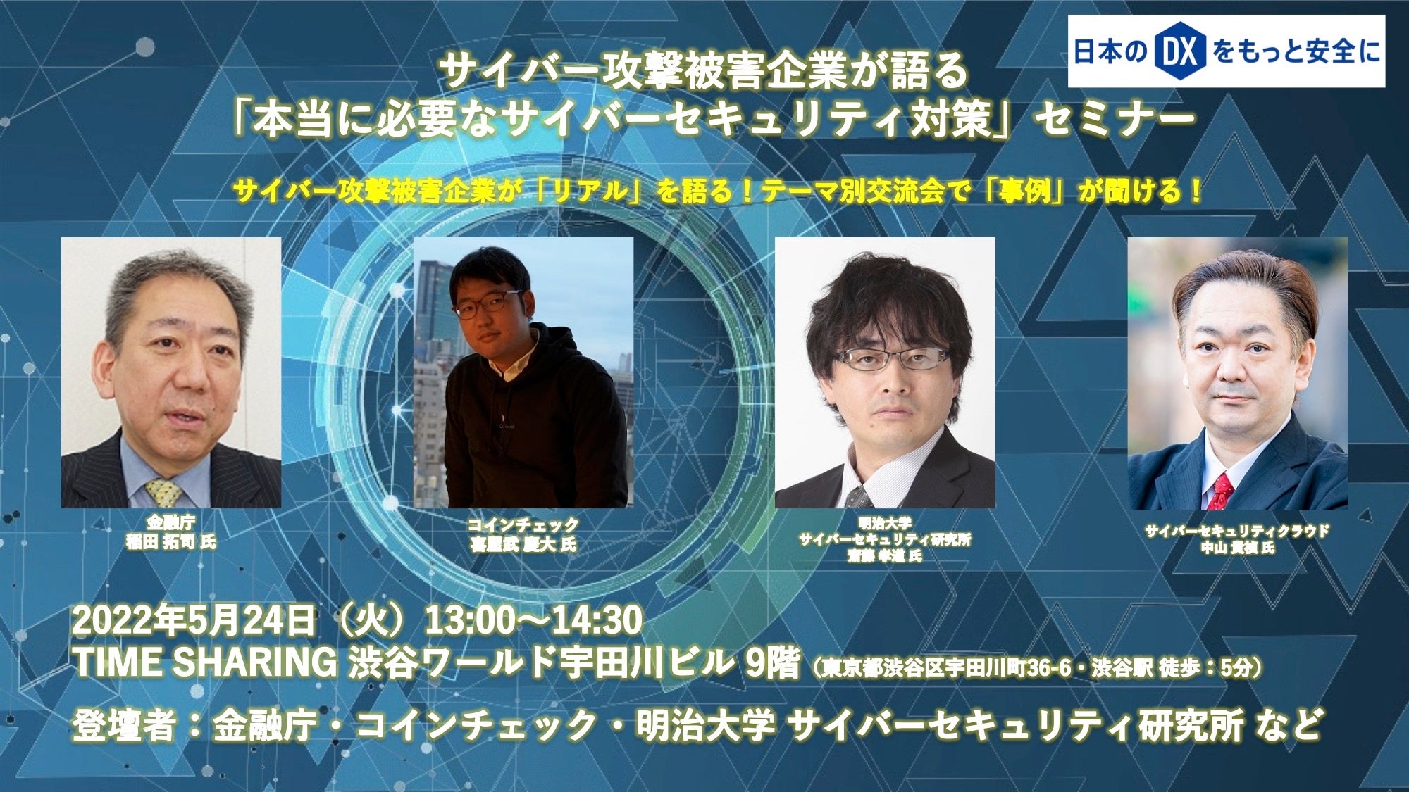 その後はコインチェック株式会社のサイバーセキュリティ推進部長である喜屋武慶大氏、明治大学サイバーセキュリティ研究所の齋藤孝道教授、株式会社サイバーセキュリティクラウドの技術広報の中山貴禎氏に登壇いただき、「『2つのインシデント』を乗り越えたコインチェックの『中の人』の体験談」についてトークセッション形式で語っていただきました。トークセッションでは「サイバー攻撃を受けると起きること」「サイバー攻撃を受けたときにすべきこと」という観点から、他ではなかなか聞くことのできない「サイバー攻撃及びサイバーセキュリティのリアル」について、赤裸々に語っていただきました。