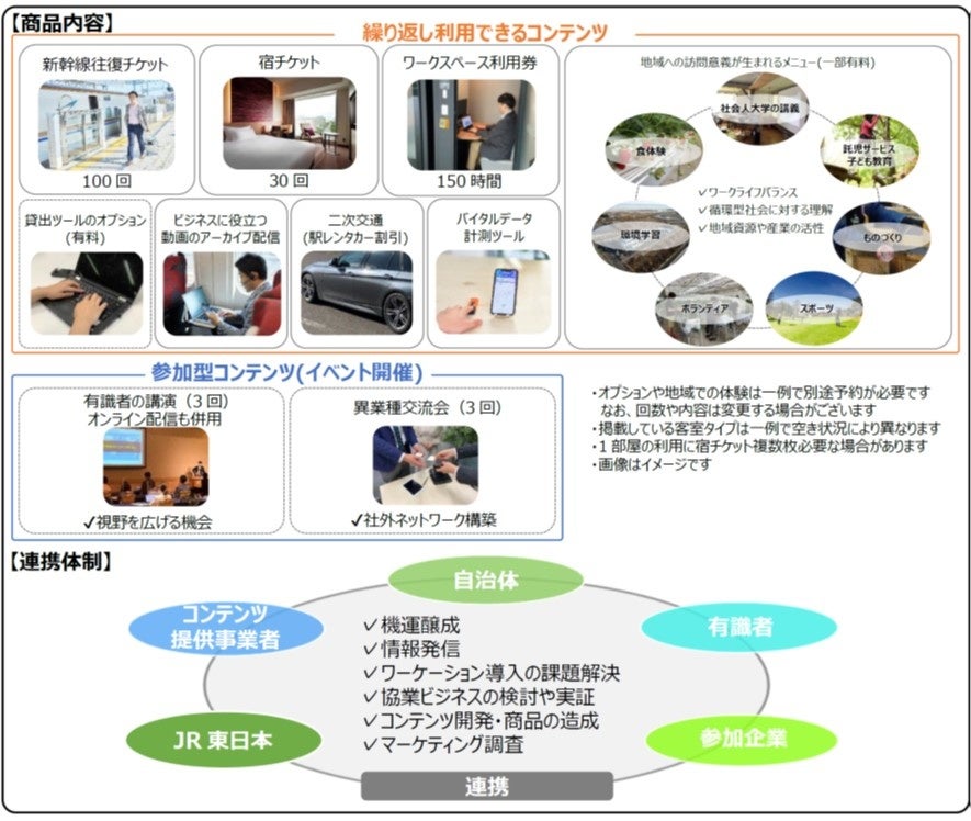 新幹線・宿泊・ワークスペースが繰り返し利用でき、有識者講演などもセットになり、ニーズに応じて地域への訪問意義が生まれるワーケーション商品を企業向けに期間・数量限定で販売します。また、ご購入いただいた企業と共同でマーケティング調査を実施、活用することにより、企業のワーケーション導入に向けたサポートを行っていきます。