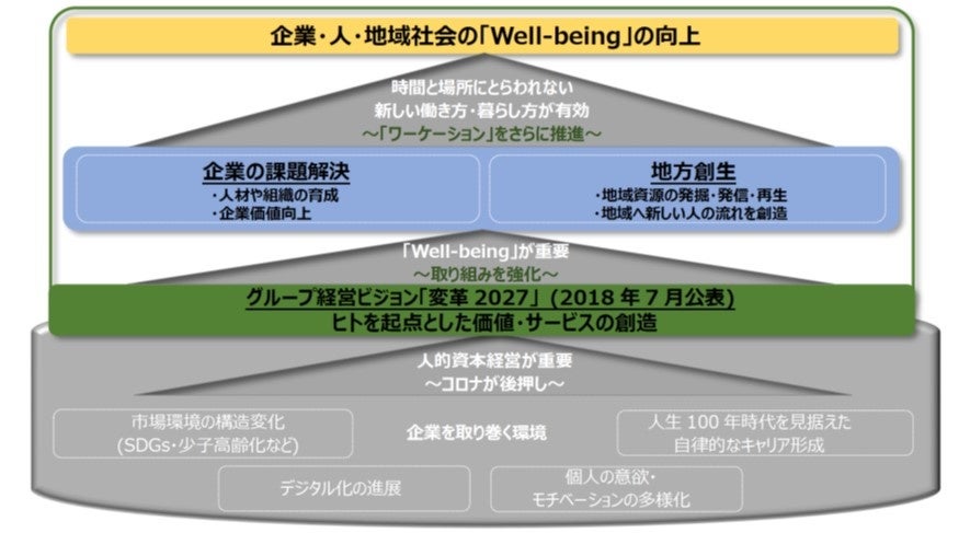 企業を取り巻く環境が加速度的に変化し、持続的な成長に必要な人的資本経営の重要性が増す中、時間と場所にとらわれない働き方が求められています。JR東日本グループは、地方創生にも寄与するワーケーションの取り組み推進を通じて、企業・人・地域社会に対し「Well-being」を高め、新たな価値を提供していくことを目指します。