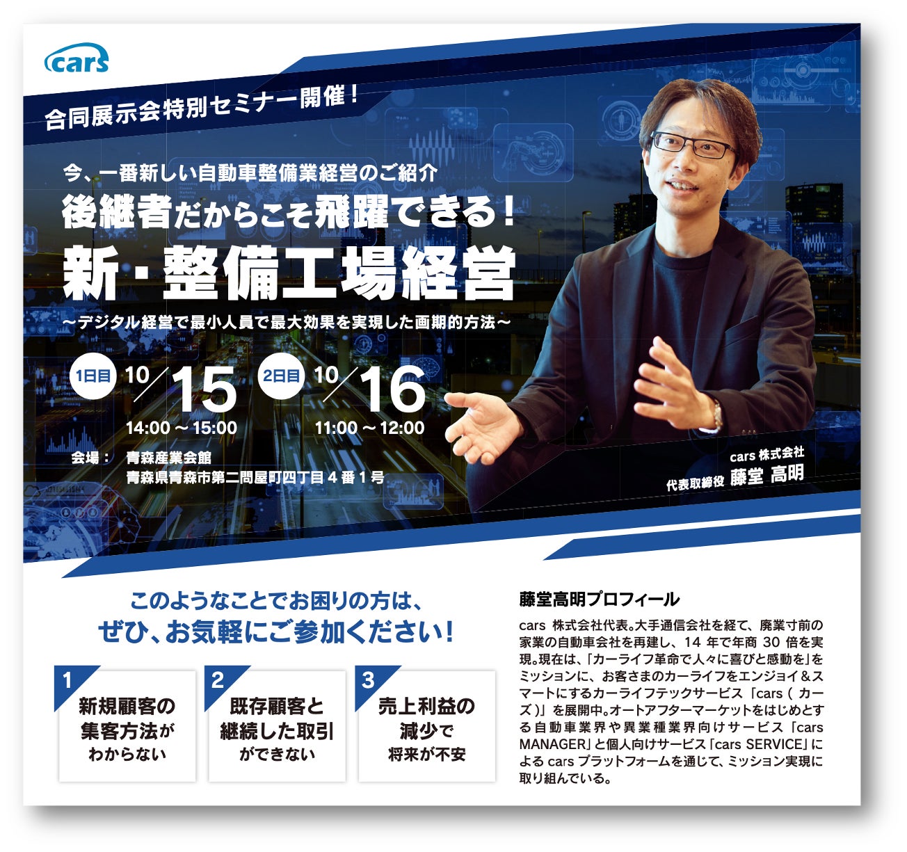 第13回青森県自動車部品商組合合同展示会2022にてグローバルカーライフテック「cars」が自動車整備業経営者向け特別セミナーおよびブース展示を行います。