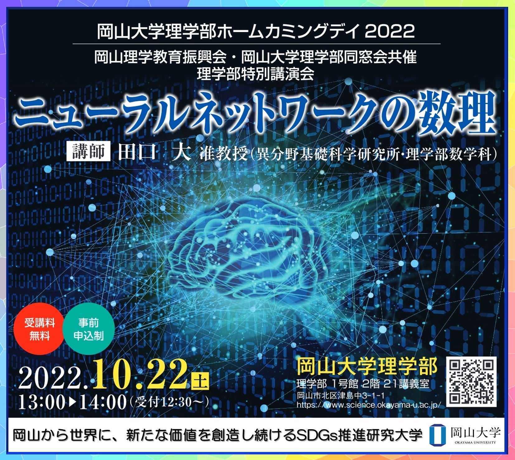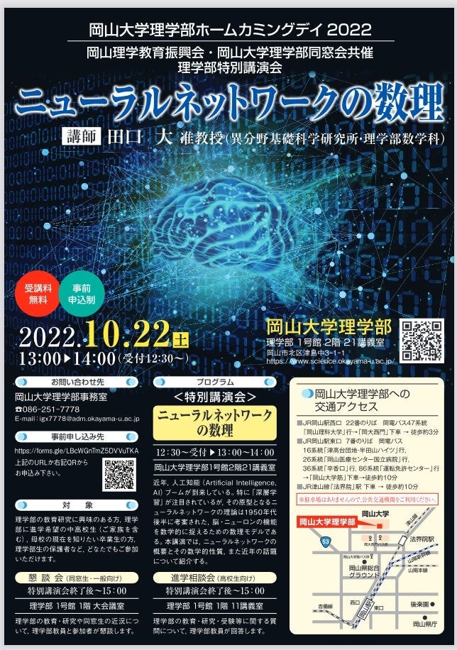 国立大学法人岡山大学(本部:岡山市北区、学長:槇野博史)の理学部では、2022年10月22日(土)に開催される「岡山大学ホームカミングデイ2022」に合わせて下記のイベントを開催いたします。
