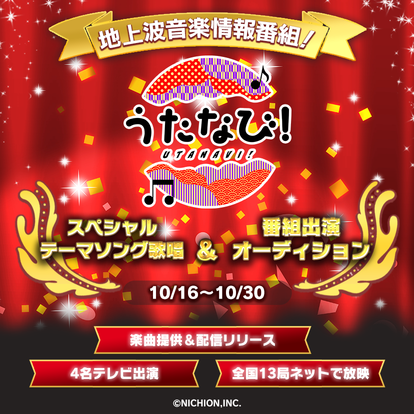 地上波のテレビ番組とライブ配信がタッグを組み実施するオーディションイベント「地上波音楽情報番組『うたなび!』スペシャルテーマソング歌唱&番組出演オーディション」に、ぜひご注目ください。