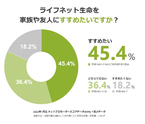 ライフネット生命は、ご契約者さまからいただく評価を表す指標として、ネットプロモータースコア(NPS)®*1を採用しています。ネットプロモータースコア(NPS)®とは、お客さまからの「信頼」「愛着」を数値化して測る指標の1つです。アンケートでは、「ライフネット生命を家族や友人にすすめたいですか?」と質問を行い、最高10点から最低0点の範囲で評価いただいています。ウェブサイトにおいては、ライフネット生命を「すすめたい(評価10点から9点)」「どちらでもない(評価8点から7点)」「すすめたくない(評価6点以下)」の割合を公開しています。