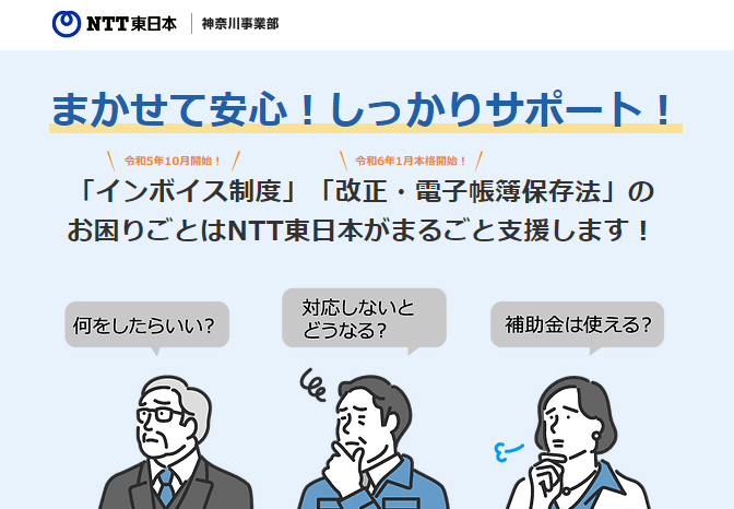 東日本電信電話株式会社 神奈川事業部(執行役員 神奈川事業部長:中西 裕信、以下「NTT東日本」)は、2022年1月の電子帳簿保存法の改正により様々な要件緩和が行われ、2023年10月にはインボイス制度の導入により、消費税の仕入税額控除条件が変更となる等、経理・請求書発行業務のあり方が大きく変わることを踏まえて、特設サイトを6月3日に公開して地域の中小企業・個人事業主様からのご相談受付を開始しました。