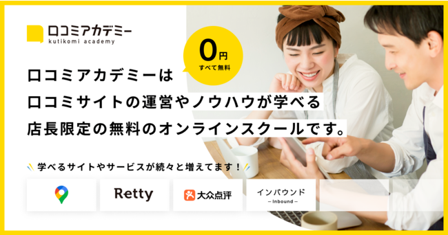 「口コミアカデミー」は、口コミサイトの運営方法や集客ノウハウが学べる、店舗事業者を対象とした完全無料のオンラインスクールです。