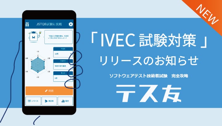 この度、当社が提供する「テス友」において、ユーザーのご利用いただいている皆様のご要望にお応えし、「IT検証技術者認定試験(IVEC)※1」対策用のコンテンツを新たに実装いたしました。