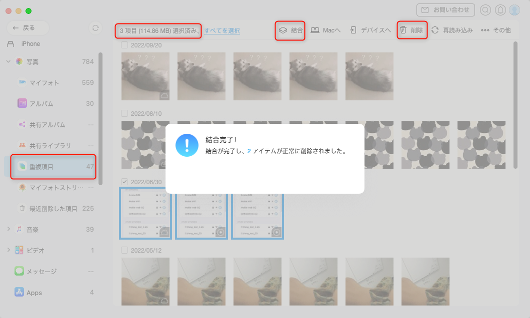 Step 3.「重複項目」に入って削除したい写真を選択して、右上の「結合」ボタンをクリックして重複した写真を結び合わせて一つにします。(注:「削除」ボタンをクリックしたら重複した写真をすべて削除します)