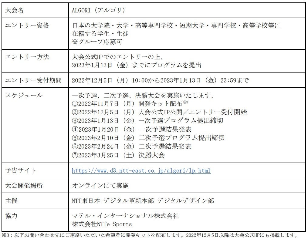 東日本電信電話株式会社(以下「NTT東日本」)は、学生のプログラミング技術の向上、学習機会の創出を目的に、UNO®で対戦するプログラミングコンテスト「ALGORI(アルゴリ)」を2023年1月から3月にかけて、日本で初めて※1開催いたします。