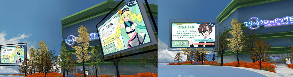 『VTuber時計』は、キャラクターショップが集積された1号館の入り口の左右に1か所ずつ、2枚の大型モニターに設置されていましたが、現在建設中の2号館入口にも2か所設置となりました。合計4枚のモニターに表示される紹介画像は、各モニターに異なるVTuberが表示されるように仕様変更し、VTuberの方々の表示機会も4倍に増えるようにリニューアルいたします。