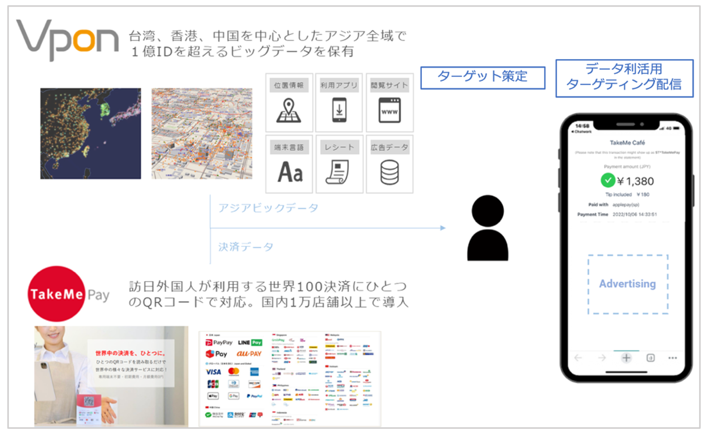 2008年に台湾で創業し、2014年に日本法人として設立されたVponは、台湾・香港などアジア圏のモバイル広告ネットワークをもとに取得した1億I Dを超えるビッグデータを保有しています。また、2015年に創業したTakeMeは、訪日観光客がスムーズに決済できるよう世界100以上の決済サービスを1つのQRコードで対応する「TakeMePay」を日本国内で提供しており、国内1万社以上の導入実績をもとにした決済データを保有しています。これらのデータを活用することで、ターゲットをより明確に策定した新しいデータ利活用ターゲティング配信が可能になります。