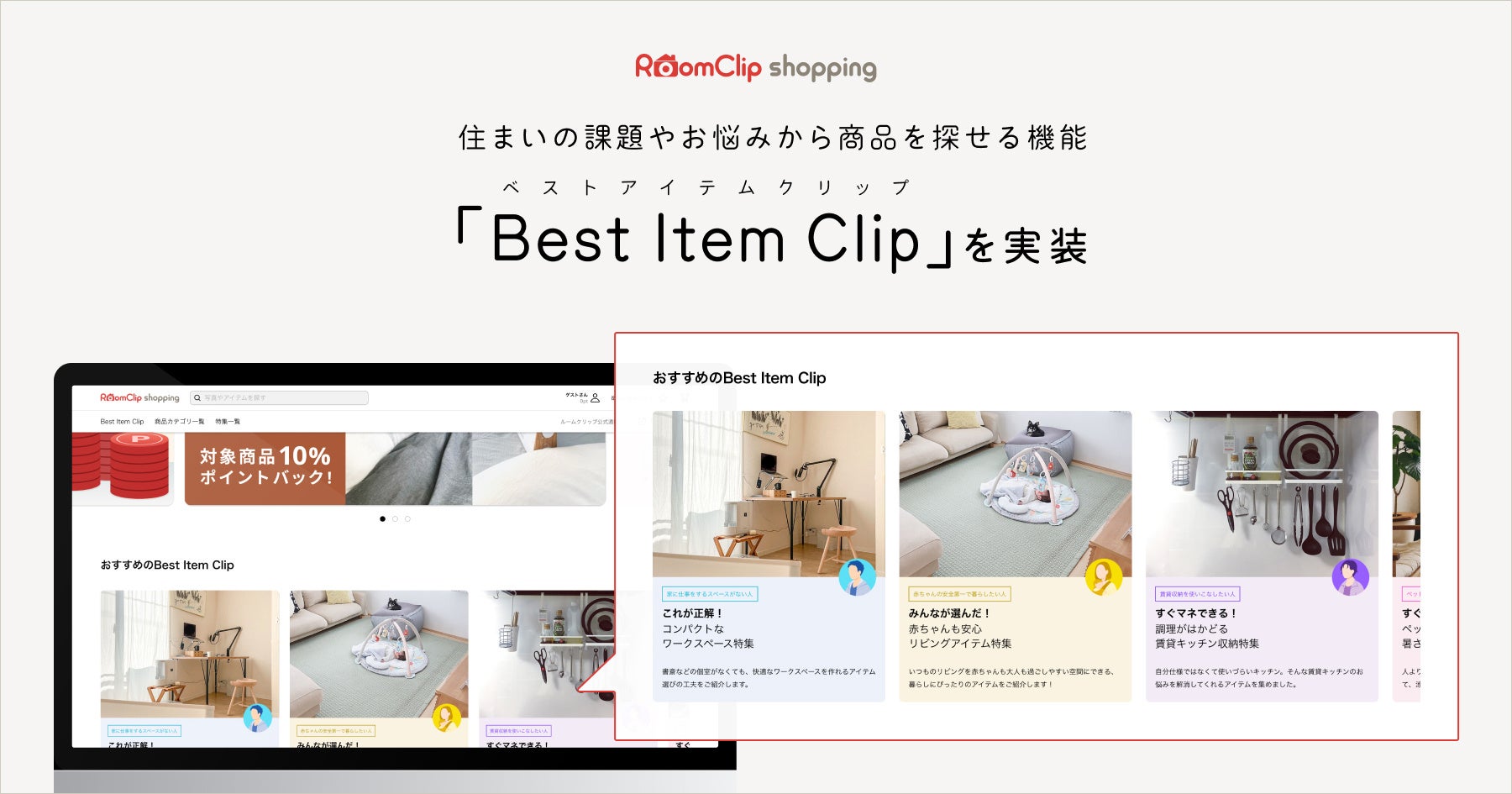 このような課題を解決するため、RoomClipに既に多数投稿されている、住まいや暮らしの課題やお悩みを解決する商品の活用シーンに着目しました。ユーザーの投稿データ等を元に「課題」や「お悩み」を解決する商品の活用シーンを「Best Item Clip」としてコンテンツ化することで、ユーザーは自身の目的を叶える商品に簡単に辿り着くことが可能になります。自分の好みに合わせて住生活を変える機会を増やすことにつながります。