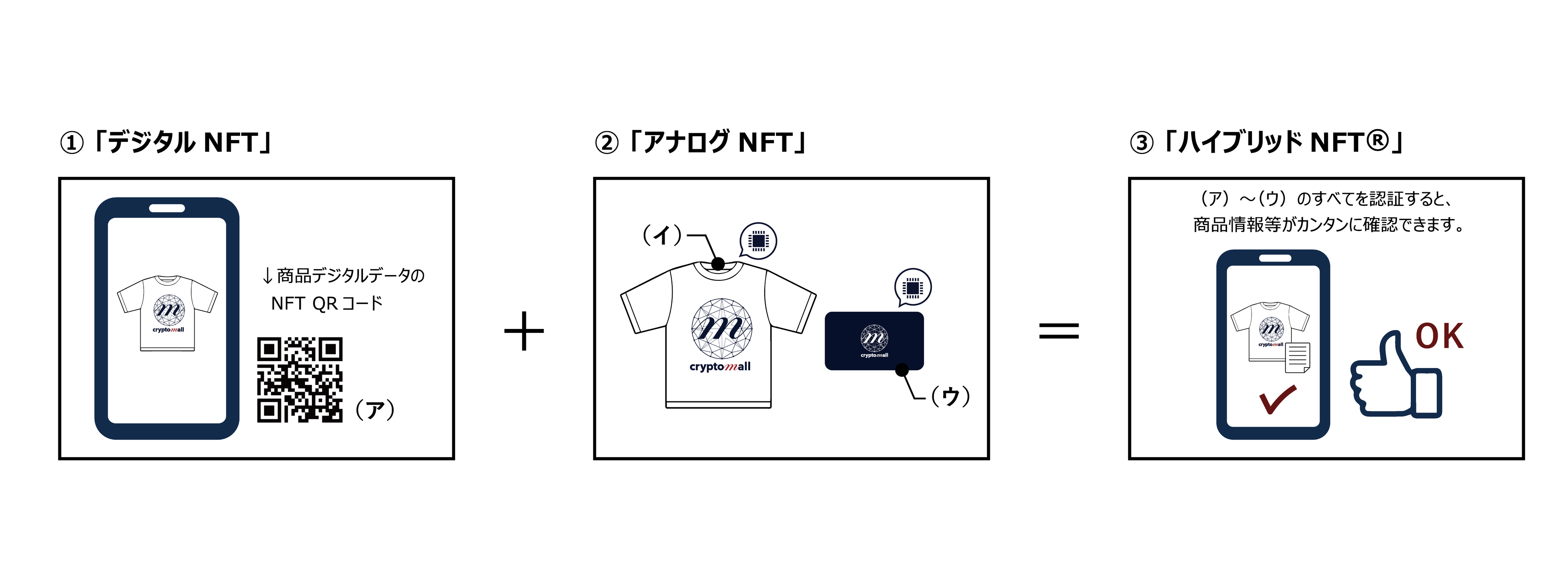 「ハイブリッドNFTマーケットプレイス(R)」とは、マーケットプレイス上で物理的商品(=「アナログ財」)を購入すると、当該商品の「デジタルNFT」が自動的に付与され、「真贋証明」および 「サプライチェーン(トレーサビリティ)」を100%担保した状態で、お手元に物理的商品が届くという全く新しい形式のショッピングモールです。