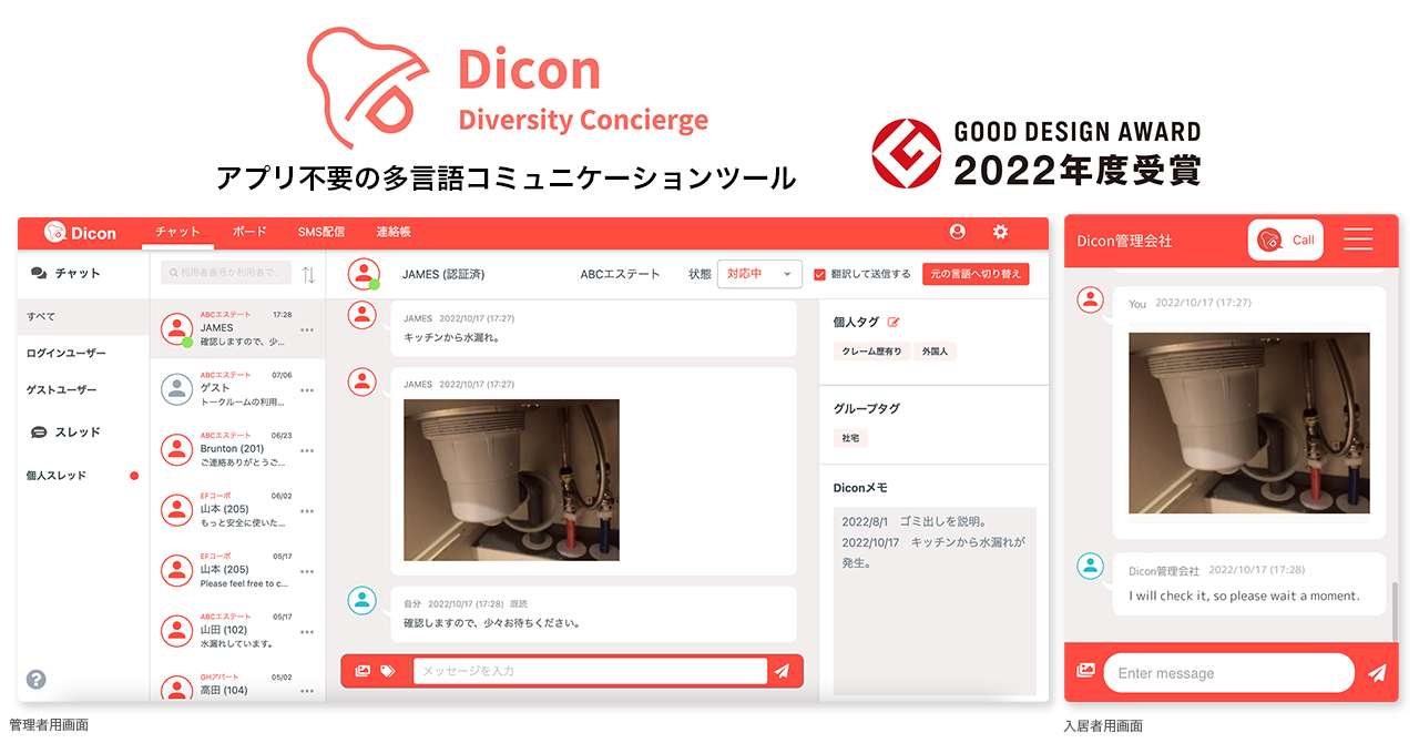 Diconは、アプリ不要の多言語コミュニケーションツールで、企業と顧客のコミュニケーションをチャットにより円滑にするサービスです。この度「Dicon」が、“誰でも扱える画面デザイン、日本語に不慣れな外国人に向けた設計の翻訳機能”について評価され「グッドデザイン賞2022」を受賞いたしました。これを機に、より多くの企業に「Dicon」を提供するため、販売パートナー(販売代理店)の募集を拡大いたします。