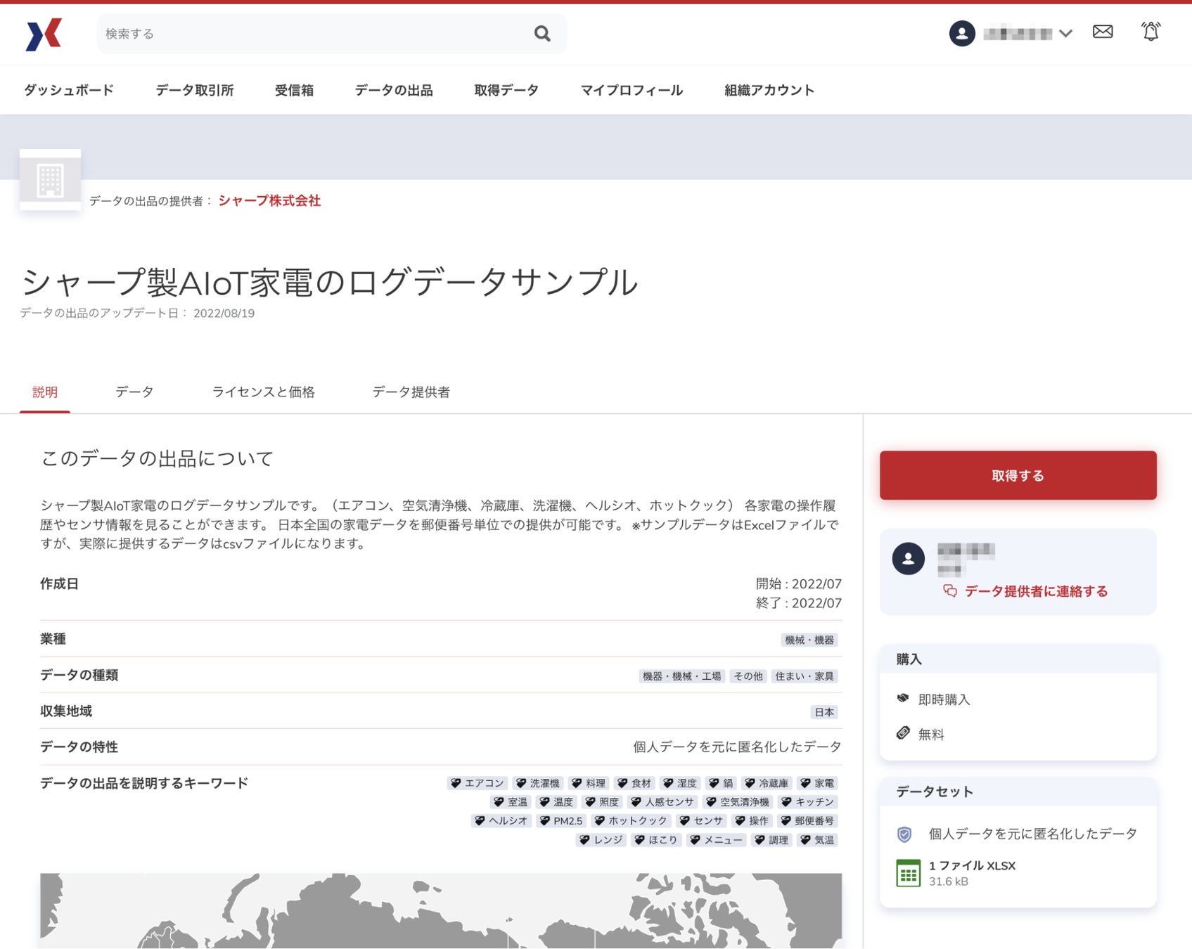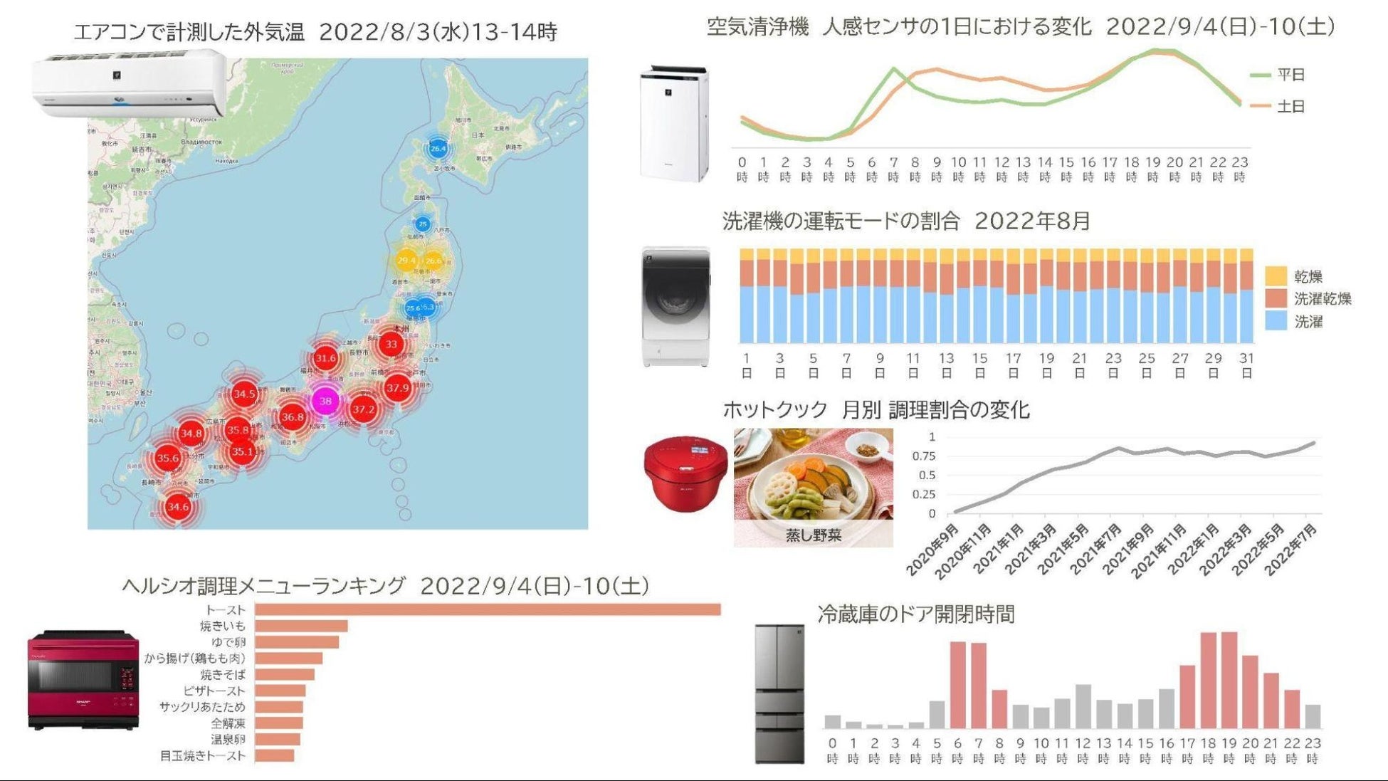 シャープ製AIoT(※)家電のクラウドログデータで、個人が特定できない形式に加工されています。 家電製品の操作履歴(選択したメニュー、運転モード等)や家電製品のセンサー情報(温湿度、ニオイ、ほこり等)などがわかります。 エアコン、空気清浄機、冷蔵庫、洗濯機、ヘルシオ、ホットクックのログデータが含まれています。