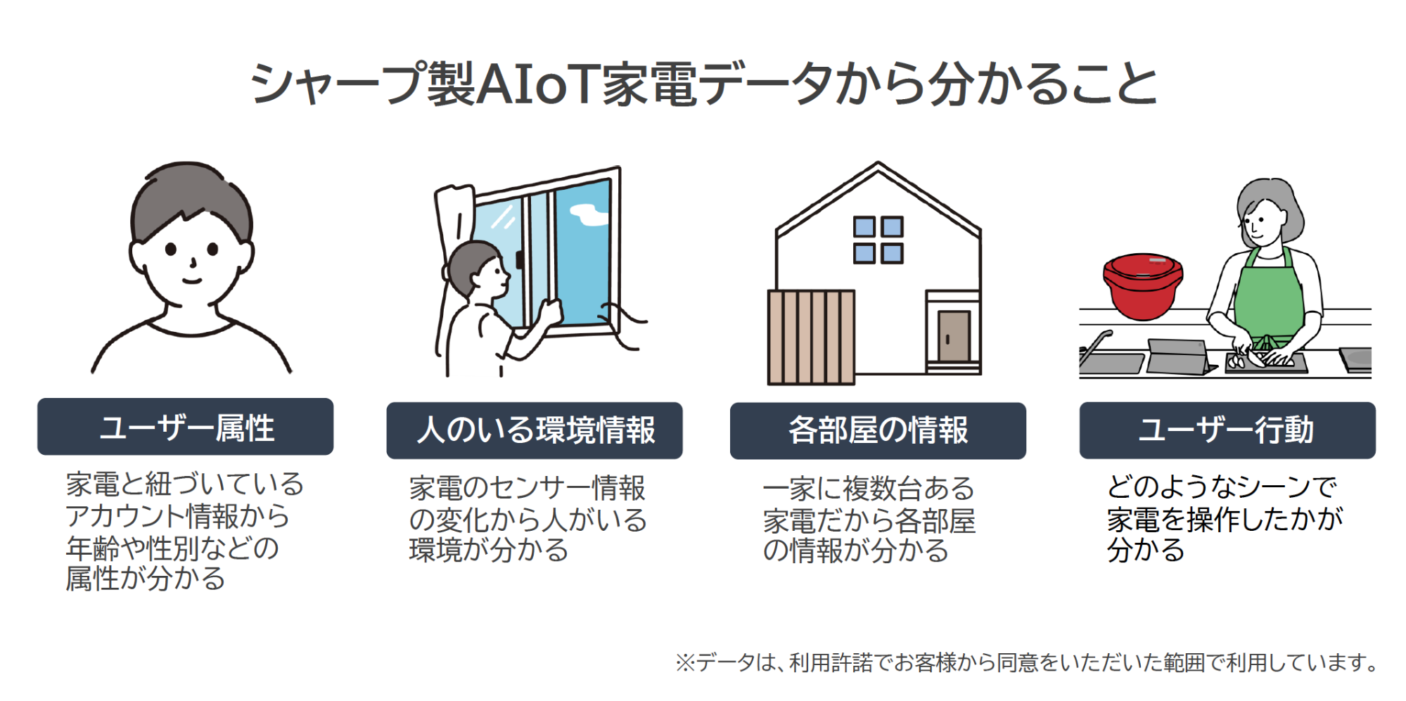 シャープ製AIoT(※)家電のクラウドログデータで、個人が特定できない形式に加工されています。 家電製品の操作履歴(選択したメニュー、運転モード等)や家電製品のセンサー情報(温湿度、ニオイ、ほこり等)などがわかります。 エアコン、空気清浄機、冷蔵庫、洗濯機、ヘルシオ、ホットクックのログデータが含まれています。
