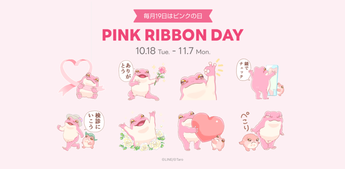 本企画では、LINEスタンプで人気クリエイターのたろさんの「カエル」が、「ピンクリボンデー」に合わせてピンク色で登場。「ありがとう」やお辞儀をするポーズの他、「鏡でチェック」や「健診にいこう」など、「ピンクリボンデー」について身近に会話しやすい言葉などを含めた合計8点のスタンプとなります。
