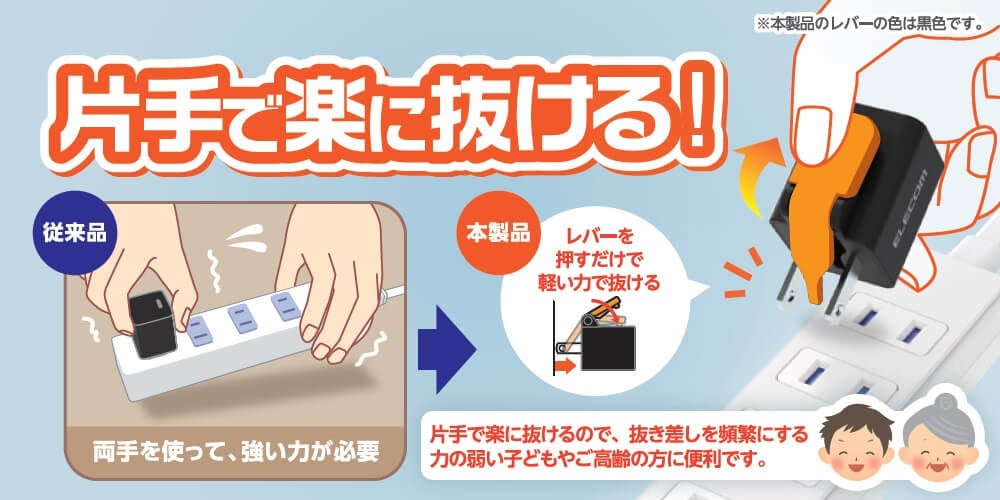 レバーを押すだけで、片手で楽にコンセントやタップから抜くことができるので、力の弱いお子さまやご高齢の方に便利なUSB AC充電器です。スマートフォン等に付属もしくは対応する充電用USBケーブルを使用して充電可能です。