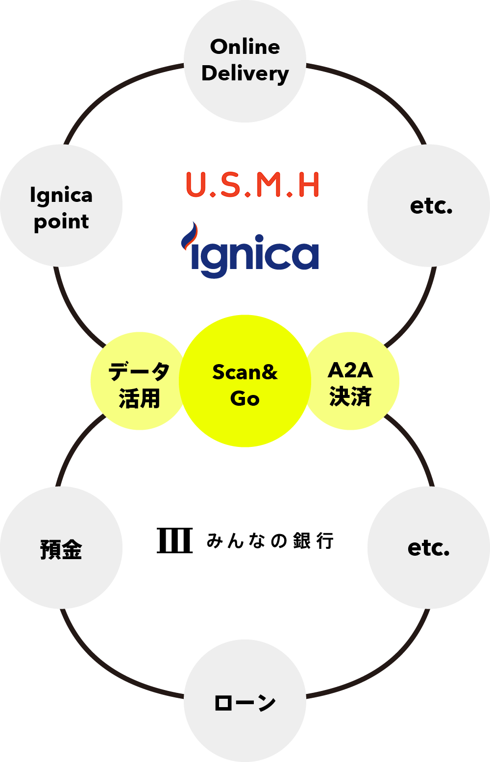 今般の基本合意では、 U.S.M.Hの「ignica」ブランドにおけるコアプロダクトであるセルフスキャン型お買い物アプリ「Scan&Go」と連携した口座直結型の新決済サービスの共同開発を皮切りに、相互のリソースを効果的に組み合わせることで実現される、デジタルを活用した最適なソリューションの構築に向けた検討を進めます。連携の具体的な内容、方法等については、関係社間での協議に目処が立ったタイミングで改めてお知らせします。