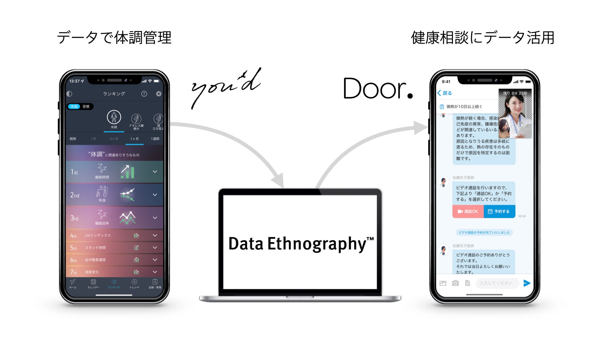 両社は、MRT株式会社が提供する医師ネットワークと繋がるアプリ「Door.」と、株式会社ヴェルトが開発した、ユーザーの日常習慣や環境と体調との関連性を解析するヘルスデータ・プラットフォーム「Data Ethnography™(データ・エスノグラフィー)」を連携し、個人のヘルスデータ履歴に基づいた医師の健康相談アドバイスを11月21日(月)より 提供開始いたします。また、取得したデータを基にData Ethnography™の因果推論機能を活用し、地域別の特徴を踏まえた健康増進策を、スマートシティ構想を進める自治体等に提案していく予定です。