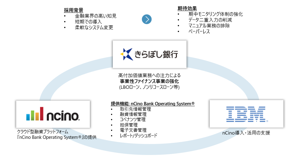 クラウドバンキングと金融サービスデジタルトランスフォーメーションの先駆者であるnCino社(NASDAQ:NCNO 本社:米国ノースカロライナ州ウィルミントン、CEO ピエール・ノーデ、日本法人:東京都港区、代表取締役社長:野村逸紀、以下:nCino)と日本アイ・ビー・エム株式会社(本社:東京都中央区、代表取締役社長執行役員:山口 明夫、以下:日本IBM)は、ストラクチャード・ファイナンス、レバレッジド・バイアウト・ローン等の事業性ファイナンスの強化を目的としたnCino Bank Operating System®を株式会社きらぼし銀行(本社:東京都港区、取締役頭取:渡邊 壽信、以下:きらぼし銀行)へ導入し、使用開始したことを発表しました。