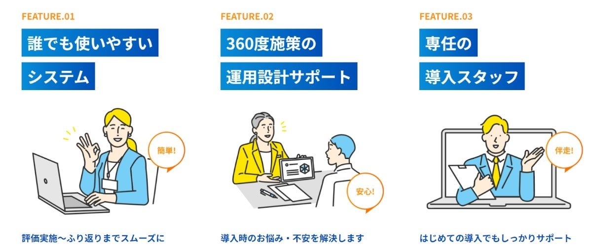 「スマレビfor 360°」の特徴は、「誰でも使いやすいシステム」「360度施策の運用設計サポート」「専任の導入スタッフ」の3点です。これまで、お客様の多数のご意見を元にバージョンアップを重ね、特にユーザビリティの高さ、導入効果を高める配慮(人事部・ユーザーへの丁寧なサポート等)に関しては高い評価をいただいております。