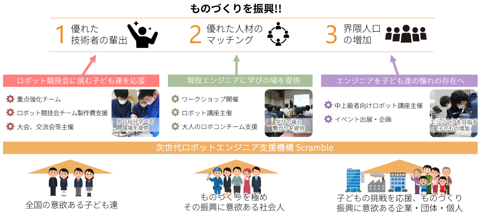 次世代ロボットエンジニア支援機構(通称Scramble)は、日本のものづくりを担う次世代のエンジニアの育成、およびものづくり業界・文化の活性化をミッションに掲げています。ロボットコンテスト(ロボコン)を人材育成の場として活用し、様々なロボコンに出場する学生・子ども達への製作費やメンター提供、ロボット製作以外にも広報、資金調達等の支援など、多岐に渡る支援事業を実施しています。また、社会人・学生合同の技術勉強会、学生向けのロボット教室等、全世代のスキルアップや初学者の参入障壁を下げる取り組み、エンジニアを憧れでカッコいい職業に感じてもらい界隈の人口増加を狙う事業を展開しています。