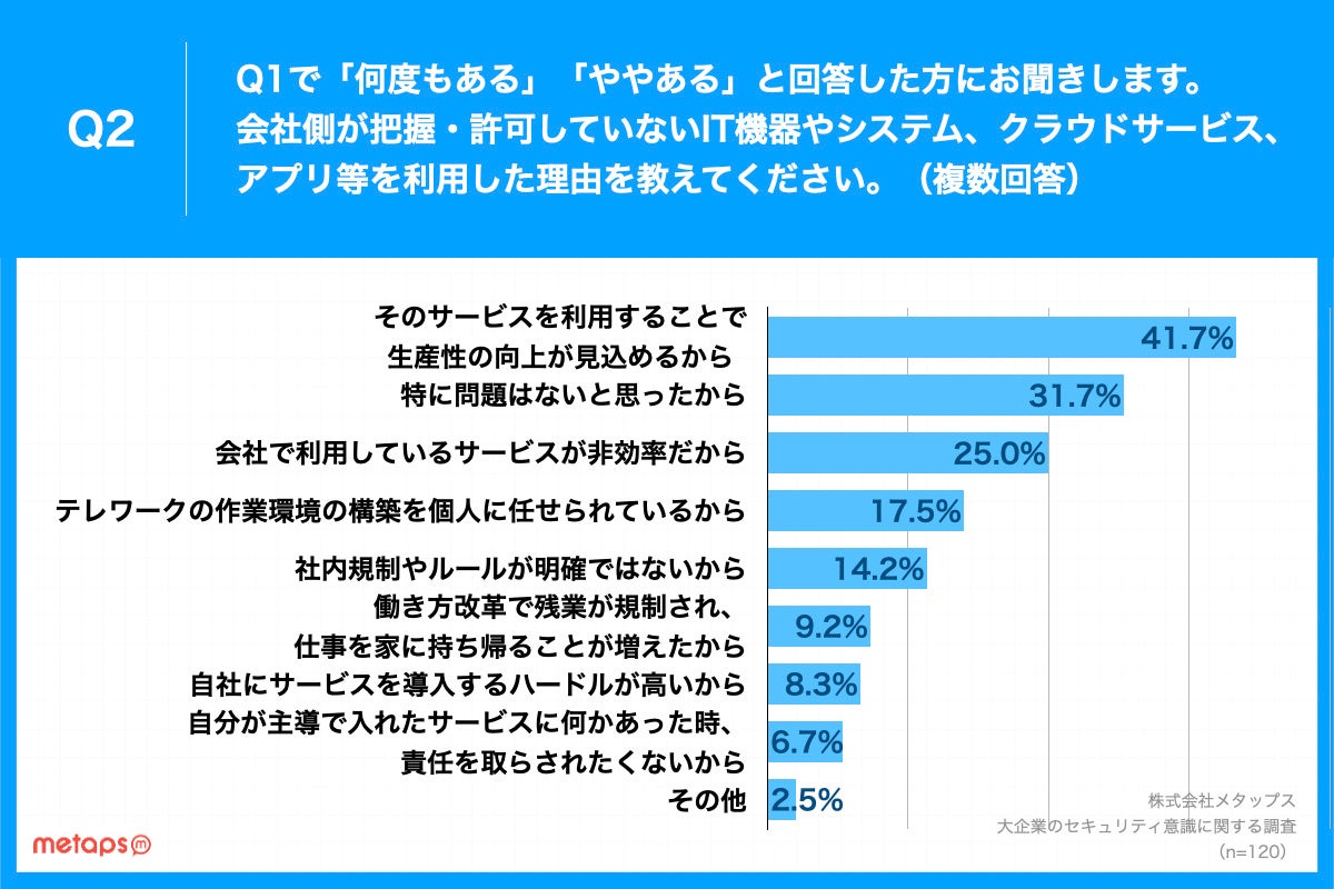 Q1で「何度もある」「ややある」と回答した方に、「Q2.会社側が把握・許可していないIT機器やシステム、クラウドサービス、アプリ等を利用した理由を教えてください。(複数回答)」(n=120)と質問したところ、「そのサービスを利用することで生産性の向上が見込めるから」が41.7%、「特に問題はないと思ったから」が31.7%、「会社で利用しているサービスが非効率だから」が25.0%という回答となりました。