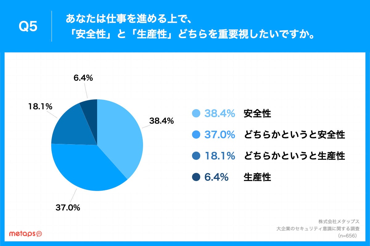 「Q5.あなたは仕事を進める上で、「安全性」と「生産性」どちらを重要視したいですか。」(n=656)と質問したところ、「安全性」が38.4%、「どちらかというと安全性」が37.0%という回答となりました。