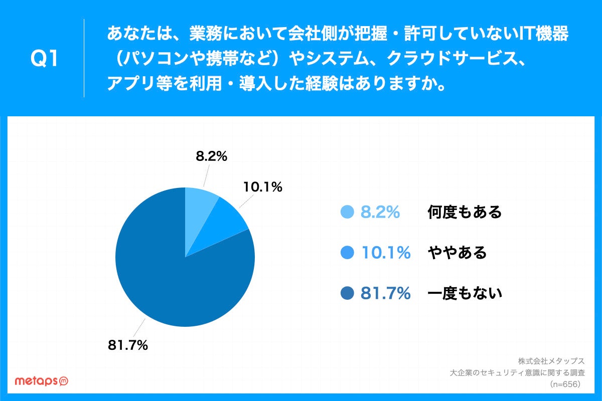 「Q1. あなたは、業務において会社側が把握・許可していないIT機器(パソコンや携帯など)やシステム、クラウドサービス、アプリ等を利用・導入した経験はありますか。」(n=656)と質問したところ、「何度もある」が8.2%、「ややある」が10.1%、という回答となりました。