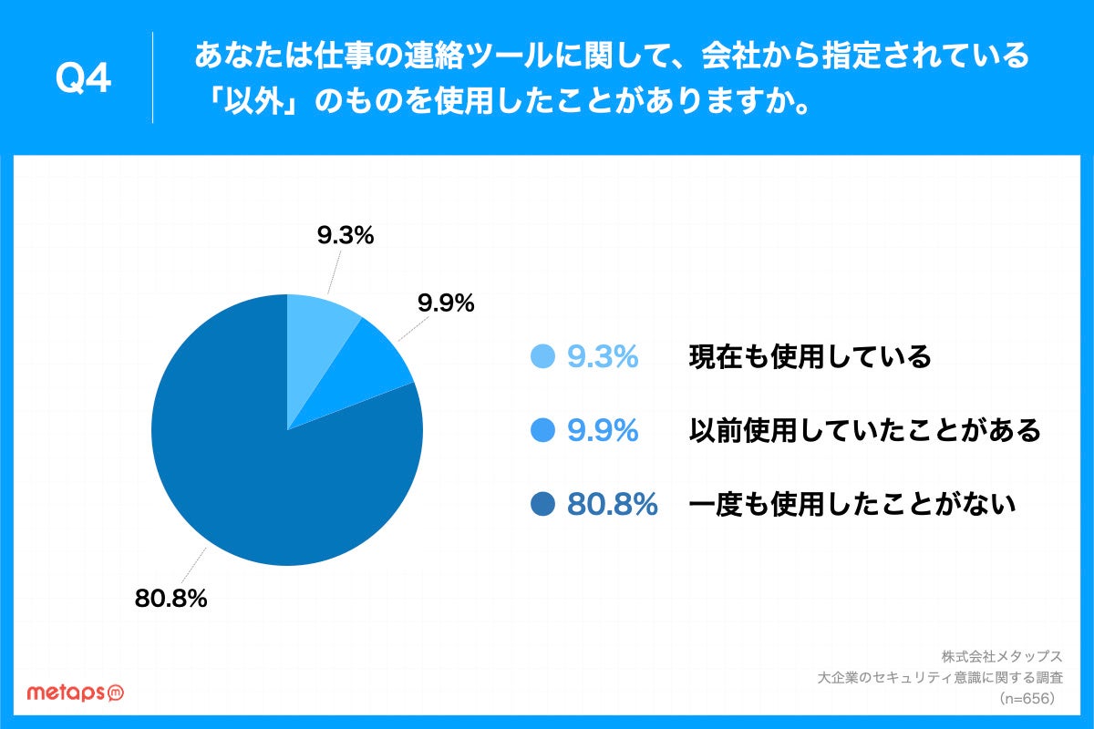 「Q4.あなたは仕事の連絡ツールに関して、会社から指定されている「以外」のものを使用したことがありますか。」(n=656)と質問したところ、「現在も使用している」が9.3%、「以前使用していたことがある」が9.9%、という回答となりました。