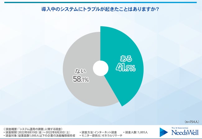 そこで、「導入中のシステムにトラブルが起きたことはありますか?」と質問したところ、『ある(41.9%)』『ない(58.1%)』という回答結果になりました。