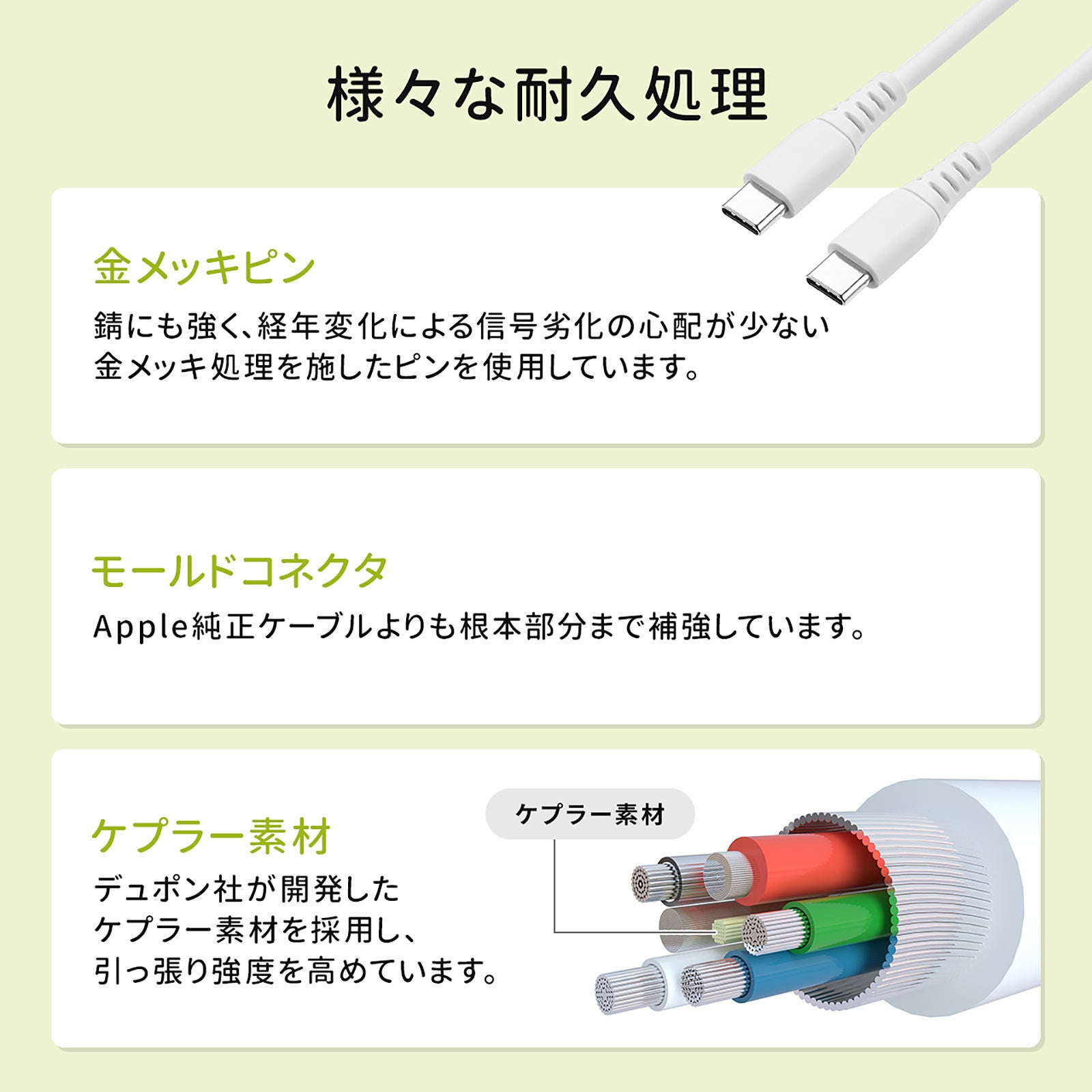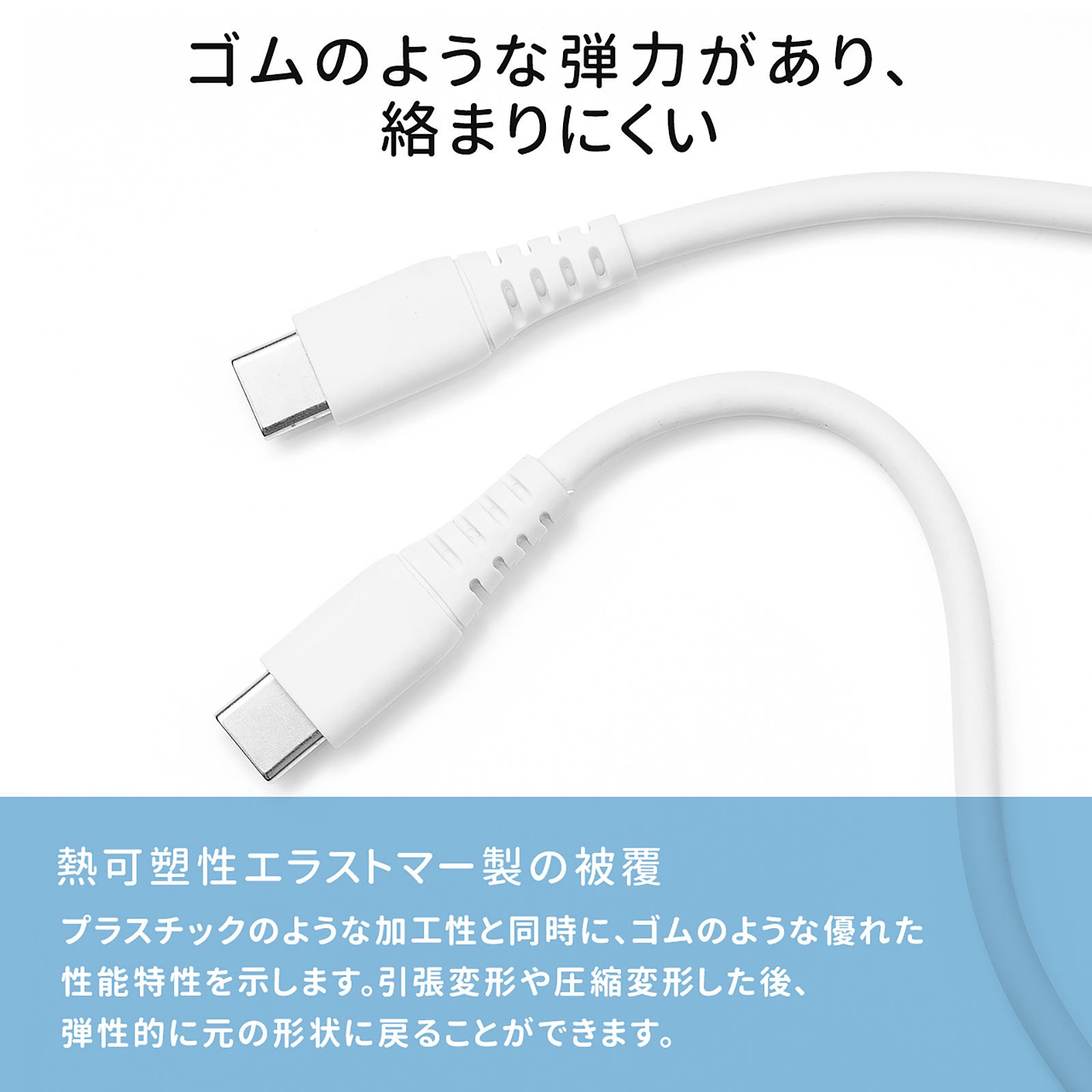 本製品は、柔らかくて、絡みにくいType-Cオス/Type-Cオスケーブルです。ゴムのような弾力を持つ熱可塑性エラストマー製の被覆で、従来のケーブルよりも柔らかいです。