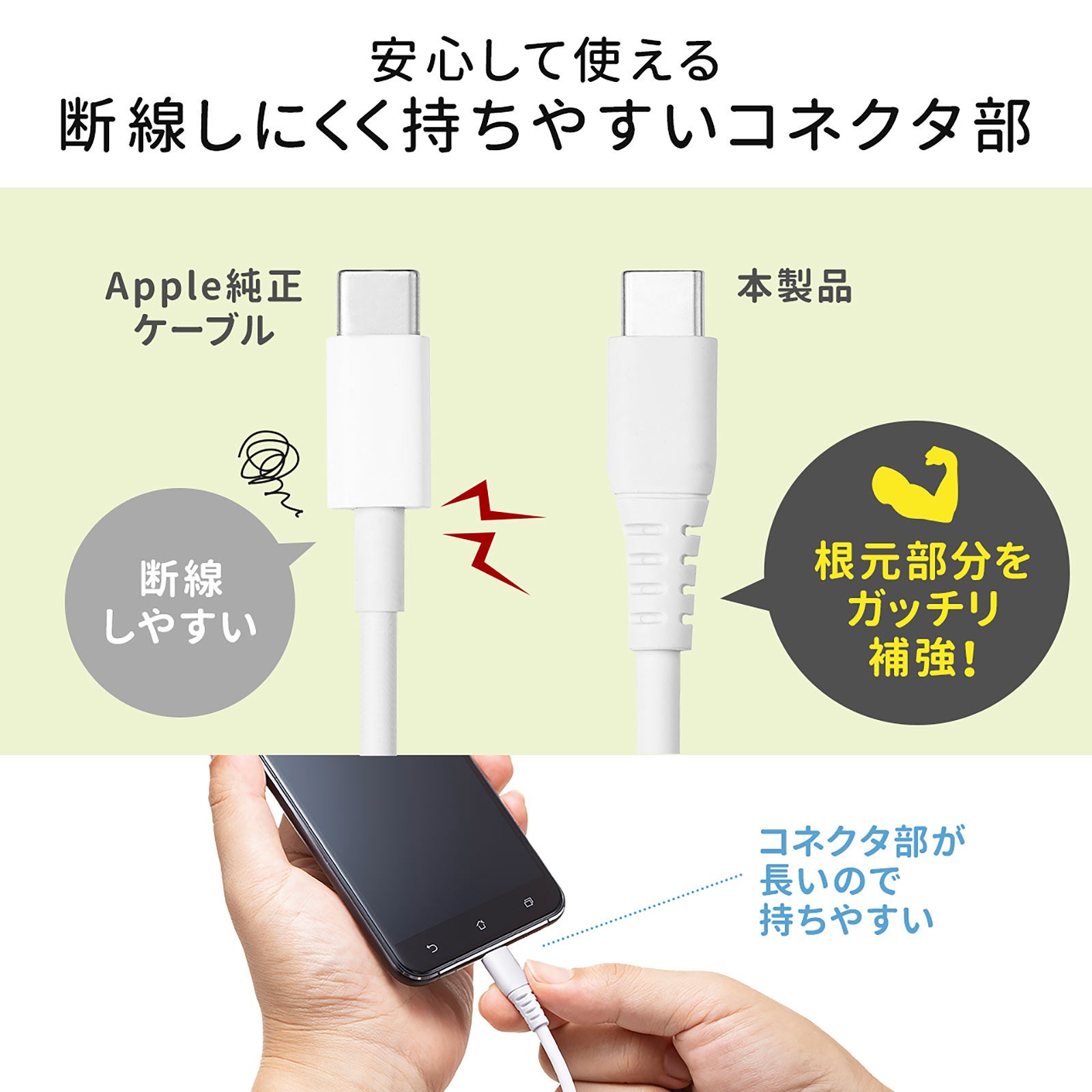 コネクタ部分は断線しにくいようにがっちり補強され、コネクタが長く持ちやすい形状です。