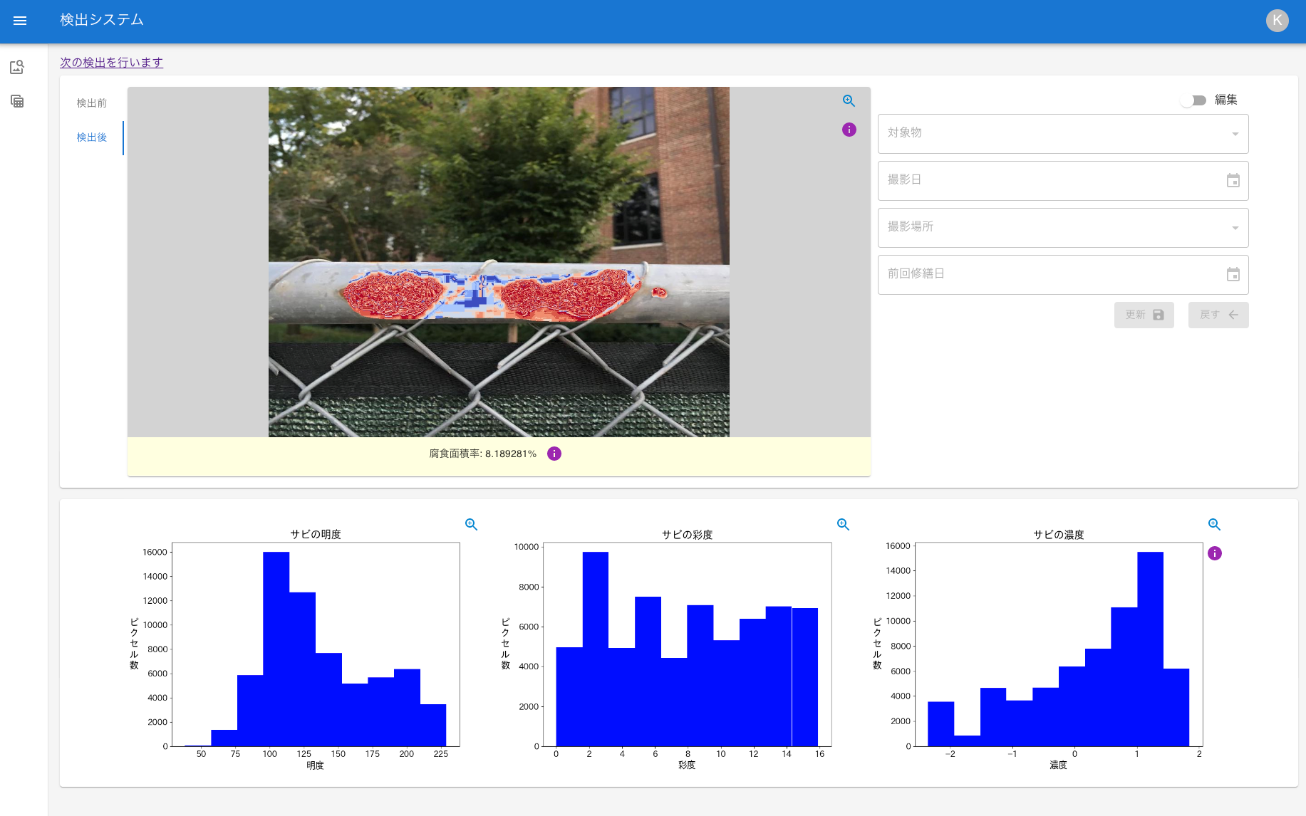 画像全体に対するサビの割合を自動計算し数値で表示します。