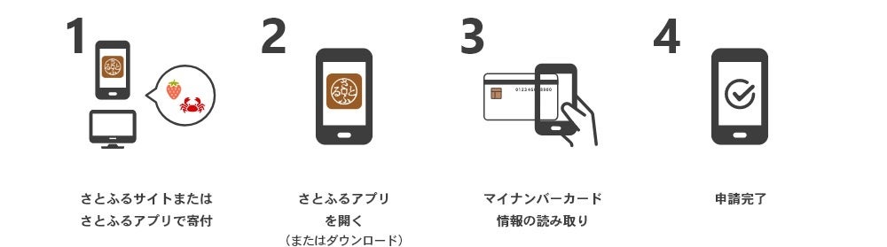 ※1 さとふるサイトから申し込みした寄付が対象。Yahoo!ショッピング版さとふるやPayPay版さとふる、LINEでふるさと納税での寄付はさとふるサイトとの連携により利用可能です。また、一部「さとふるアプリdeワンストップ申請」が利用できない自治体があります。