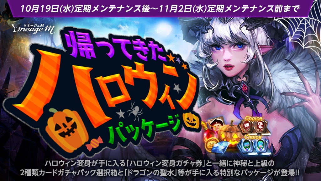 「ドラゴンのダイヤモンド」100個や、「ドラゴンの聖水(イベント)」5個など「アインハザードの祝福」増加アイテムが獲得できるアイテムに加え、定められた確率で各種ハロウィン限定変身が手に入る「ハロウィン変身ガチャ券(イベント)」1個と一緒に、「上級/神秘のカードガチャパック選択箱」1個ずつがセットになった「帰ってきたハロウィンパッケージ」が登場しました。