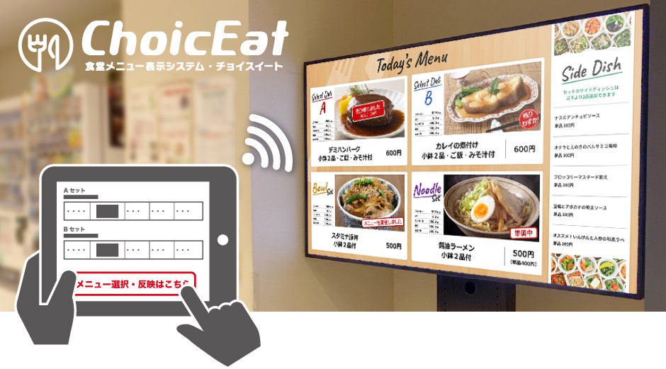 食堂メニュー表示システム ChoicEatは、食堂運営側と食堂利用者をつなげるコミュニケーションツールです。