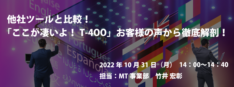 その中で他社様の機械翻訳ツールと比較しながら「T-4OO」のここが凄いよ!といったポイントを事例や実際のお客様の声を元にご説明させて頂きます。
