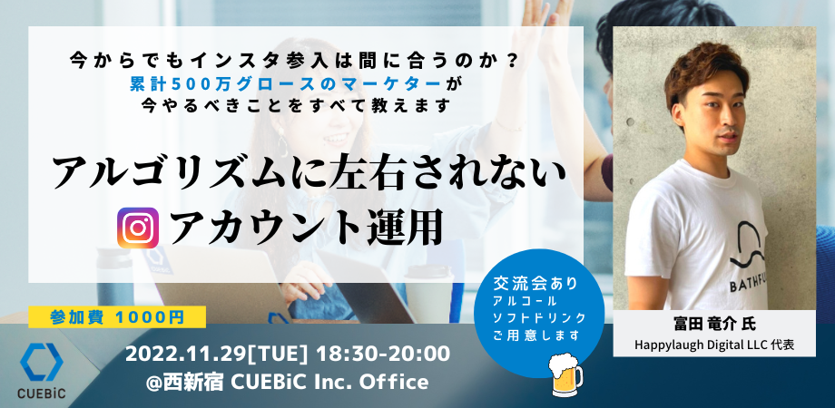 今回のセミナーでは、累計500万グロースの実績をもつHappyLaugh Digital LCC代表 富田竜介氏がInstagramの企業アカウントの活用方法をお伝えします!プロフィール設定や具体的な投稿ポイント、改善につなげるための分析術もお伝えします。明日からマネできるコツが満載です。また今回はセミナー後に、軽食とお酒をお出しいたします。マーケター同士での情報交換の場にどうぞお使いください。