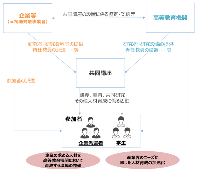 我が国の企業が、デジタル化・脱炭素化の進展といったメガトレンドの変化や、量子技術をはじめとする急激な技術革新に対応しつつ持続的な成長を続けるためには、⾼度な専⾨性を有する⼈材の育成が急務です。そのため、本事業では、企業等が、⼤学・⾼等専⾨学校等の⾼等教育機関において、自社が必要とする専門性を有する人材の育成を図るための講座やコース・学科等(以下、共同講座)を設置することを目的として費用を支出する際、当該費用の一部を助成します。こうした取組を通じ、企業の求める人材を高等教育機関において育成する環境を整備し、もって、産業界のニーズに即した⼈材育成の加速化を図ります。