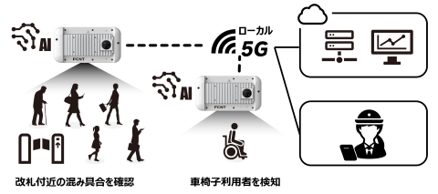 駅係員が駅構内の状況をより把握しやすくするため、AIカメラで撮影した駅構内の高精細な映像を、ローカル5G 等を活用して駅係員のモバイル端末へリアルタイムで伝送するとともに、映像の解析により、車いすや白杖の駅利用者を認識して通知するなど、駅係員業務への活用について検証します。