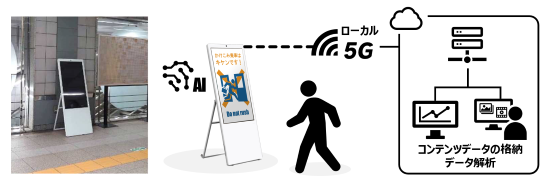 データ容量の大きい動画広告コンテンツ等を、ローカル5G 等を活用してAIサイネージに伝送します。また、サイネージに内蔵されたカメラにて、駅利用者の視聴状況の計測や広告内容に対する反応の確認を行い、効果的な情報発信への活用を検証します。