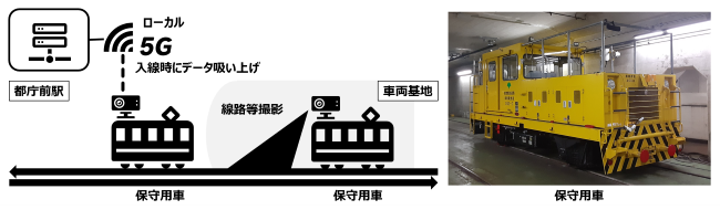 保守用車に設置した高精細カメラでトンネル内の線路や天井、壁などを撮影し、駅構内にある記録装置にローカル5G 等で伝送するとともに、AI解析による異常検知等を行い、効率的な維持管理への活用について検証します。