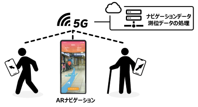 出入口からの経路が複雑な地下鉄駅構内における移動を支援するため、ARを用いたナビゲーションを実施します。5Gを活用して、駅構内のナビゲーションデータを駅利用者のスマートフォンに伝送し、そのデータと駅利用者の位置情報を重ね合わせて、目的地までの案内ルートを表示します。