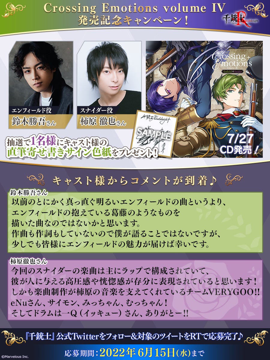「Crossing Emotions volume IV エンフィールド♰スナイダー」のCD発売と楽曲配信を記念して、『千銃士』公式Twitterアカウントでは鈴木勝吾さん(エンフィールド役)、柿原徹也さん(スナイダー役)の直筆寄せ書きサイン色紙が1名様に当たるフォロー&リツイートキャンペーンを開催しております。応募の締め切りは2022年6月15日(水)23:59まで!奮ってご応募くださいませ!