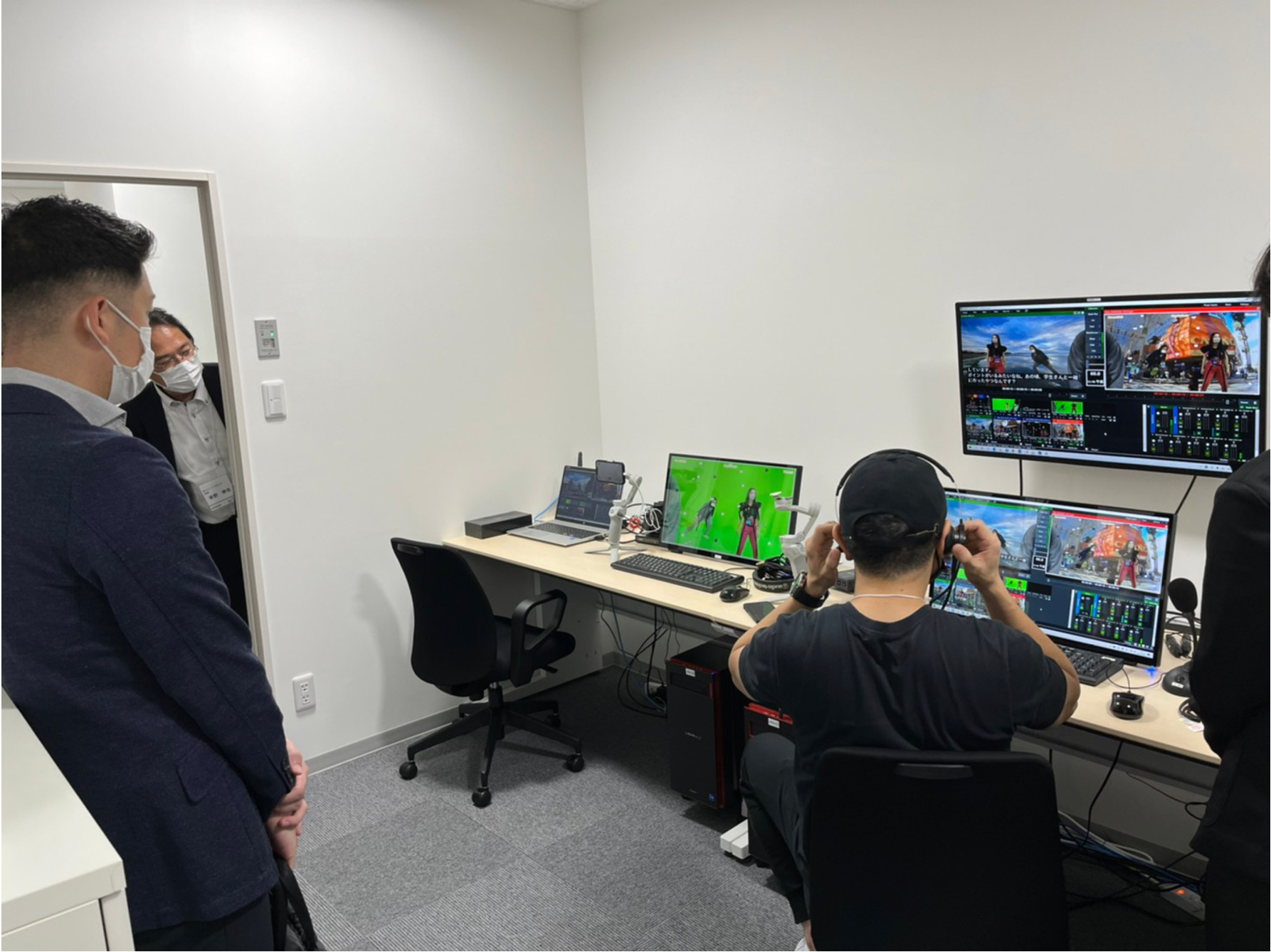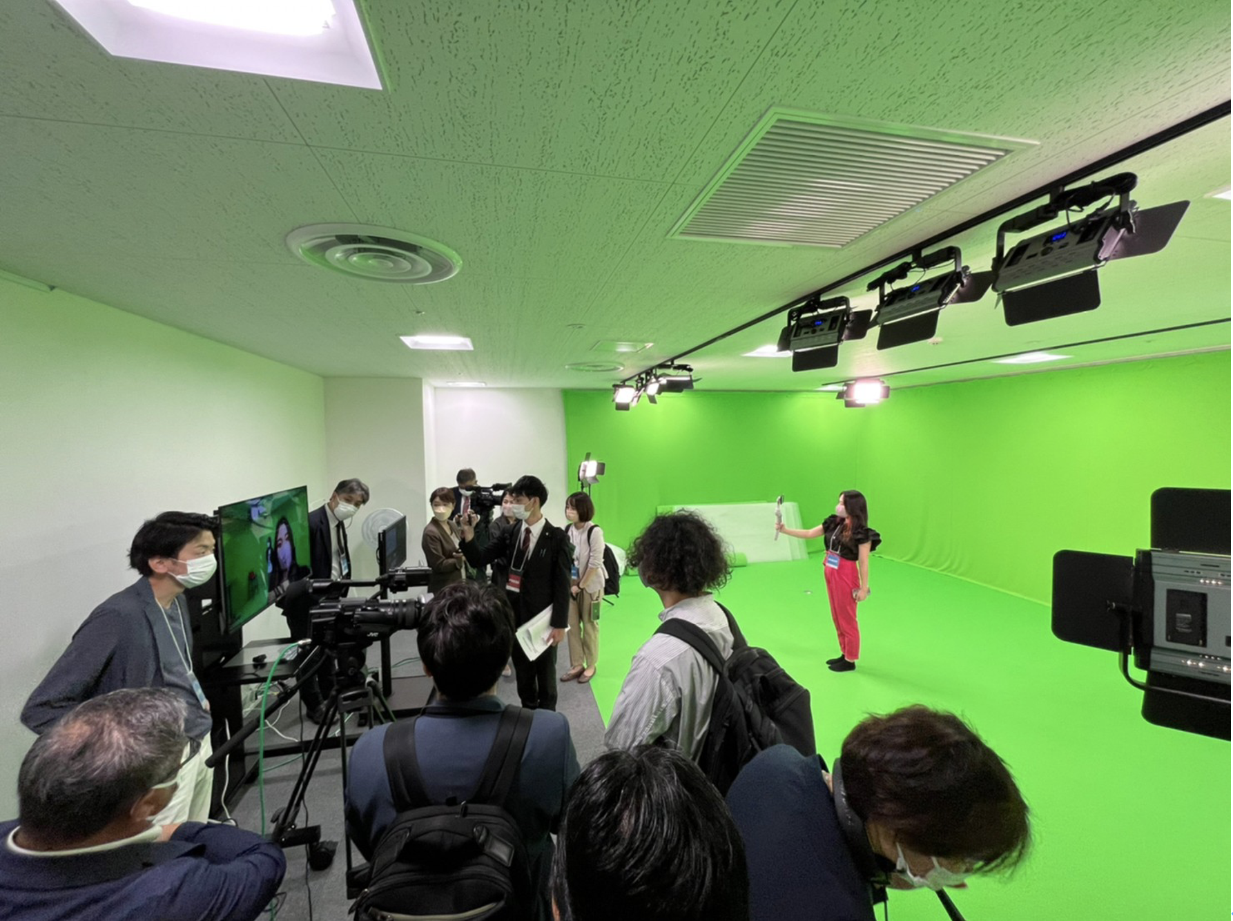 Thumb Studioは、クロマキー合成が可能なグリーンバックや映像合成が可能な最新技術を備えた、北九州最大級の大型スタジオです。同社の映像制作トータルプラットフォーム「Unixon Video Platform (略:UVP/読み:ユニゾン・ビデオ・プラットフォーム)」と連携させて利用することができます。オープニングイベントでは、パートナー企業や北九州市の関係者を招待し、配信時にAIによって発話部分をリアルタイムで文字起こしする機能やリアルタイム翻訳機能、撮影時のさまざまな映像合成技術を体感いただきました。